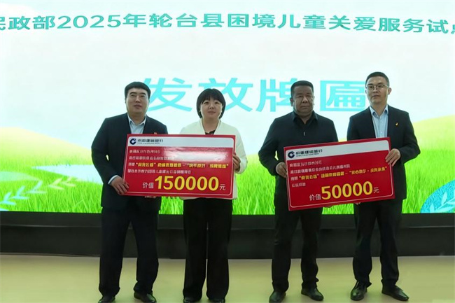 随后,建行轮台支行负责人黄金鑫、苟佳豪代表建行巴州分行,向轮台县第一中学分校及儿童福利院郑重递交20万元物资捐赠牌。在这块牌匾上,不仅镌刻着物资的价值,更承载着建行对困境儿童的深情厚谊。